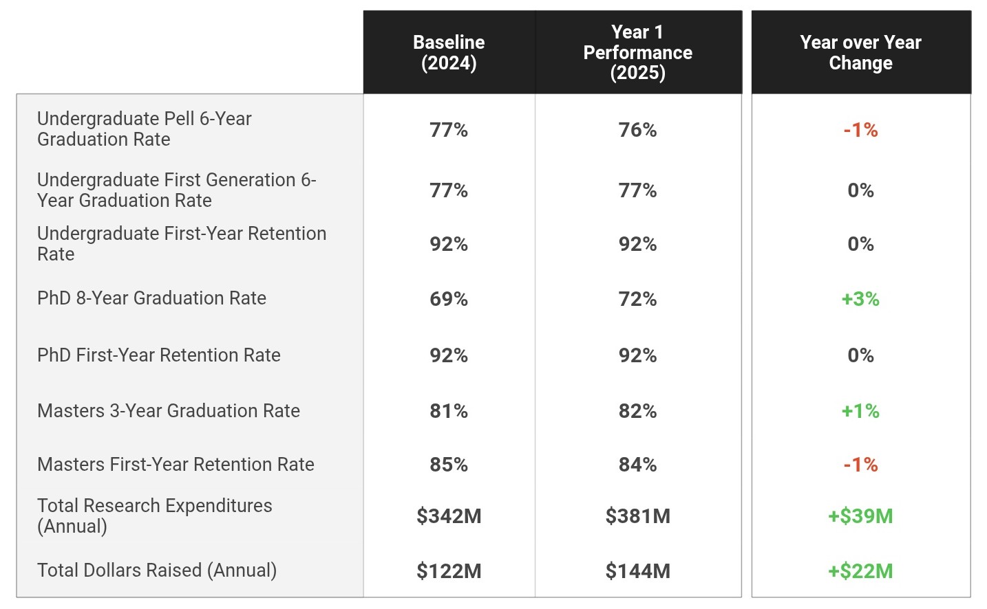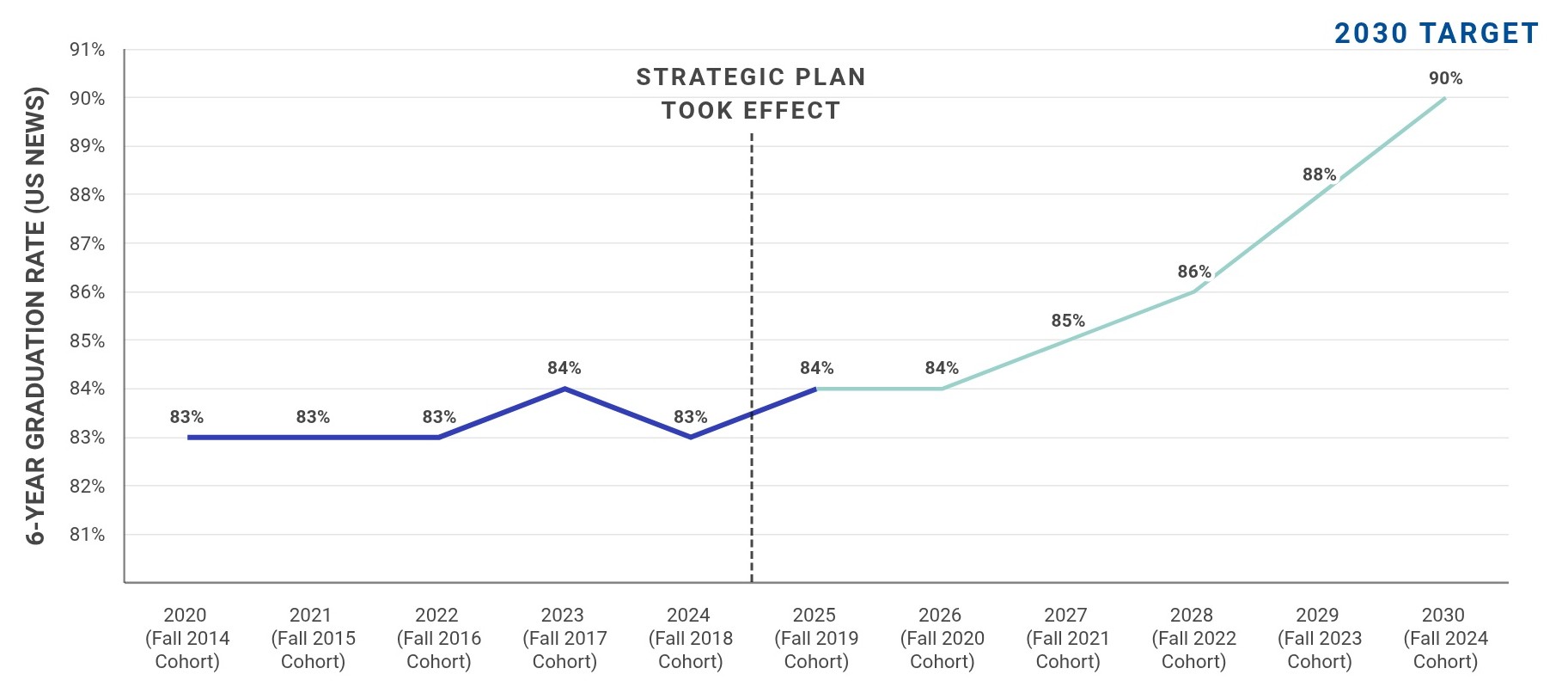 Through proactive interventions in academic support and student services, UConn's 6-year graduation rate increased by 1% in 2025, reaching the university's target of 84%.